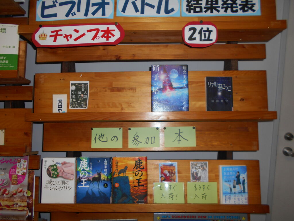 202111月17 ビブリオバトル 11月11日(ポッキーの日)にビブリオバトルが開催されました!参加者は8名、観戦者は30人集まり、自分たちの好きな本をとても熱く語っていました。結果、チャンプ本は 山田宗樹さんの「人類滅亡小説」二位は 知念実希人さんの「硝子の塔の殺人」 山田悠介さんの「リアル鬼ごっこ」でした図書館入ってすぐの左側にコーナーを作っているので気になった方は是非借りに来て下さいね